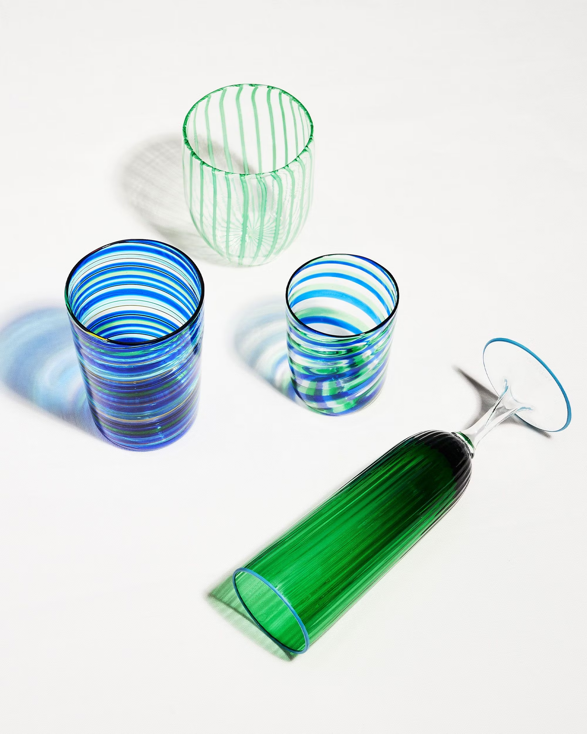 Las colecciones de platos y mantelería de Aquazzura Casa se completan con cristalería y accesorios fabricados principalmente en Murano, capital mundial del arte del vidrio y siempre en cristalerías altamente artesanales.Ésta colección se materializa en creaciones singulares, que representan la máxima manifestación de la incomparable artesanía de hábiles maestros vidrieros. Las formas y los tonos, junto con los intrincados detalles incorporados en el vidrio, pretenden armonizar y combinar perfectamente con la vajilla y la mantelería, logrando una estética impecable y cohesiva.